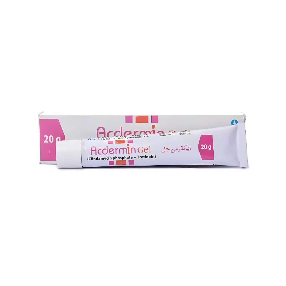 Acdermin Gel contains a combination of Clindamycin (antibiotic) and Tretinoin (retinoid), used for the treatment of acne vulgaris. It works by reducing acne-causing bacteria, unclogging pores, and promoting skin renewal, resulting in clearer and healthier skin.