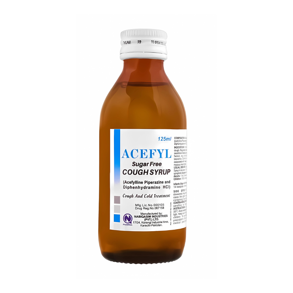 Acefyl Sugar-Free Syrup contains Acefylline Piperazine (bronchodilator) and Diphenhydramine Hydrochloride (antihistamine), formulated without added sugar. It provides relief from cough, chest congestion, and breathing difficulties associated with asthma, chronic bronchitis, and allergies. The sugar-free formula makes it suitable for diabetic patients.