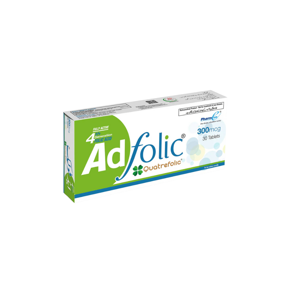 AD Folic 300mcg contains Folic Acid (Vitamin B9), an essential vitamin that supports healthy red blood cell formation and proper cell growth. It is especially important for women during pregnancy to prevent neural tube defects in babies.