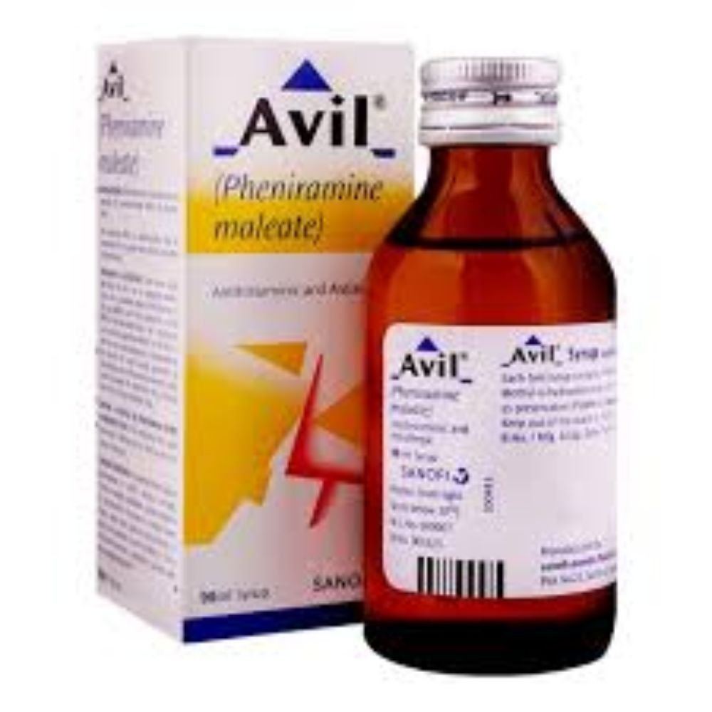 Avil Syrup (90ml) contains Pheniramine maleate, an antihistamine used to relieve allergic conditions such as runny nose, sneezing, watery eyes, itching, skin rashes, and insect bites. It is often prescribed for children and adults who prefer liquid form. May cause drowsiness; should be used only under medical supervision, with caution in driving or operating machinery.