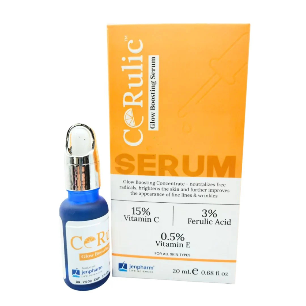 Cerulic Glow Boosting Serum is a brightening serum formulated with 15% Vitamin C, 3% Ferulic Acid, and 0.5% Vitamin E.