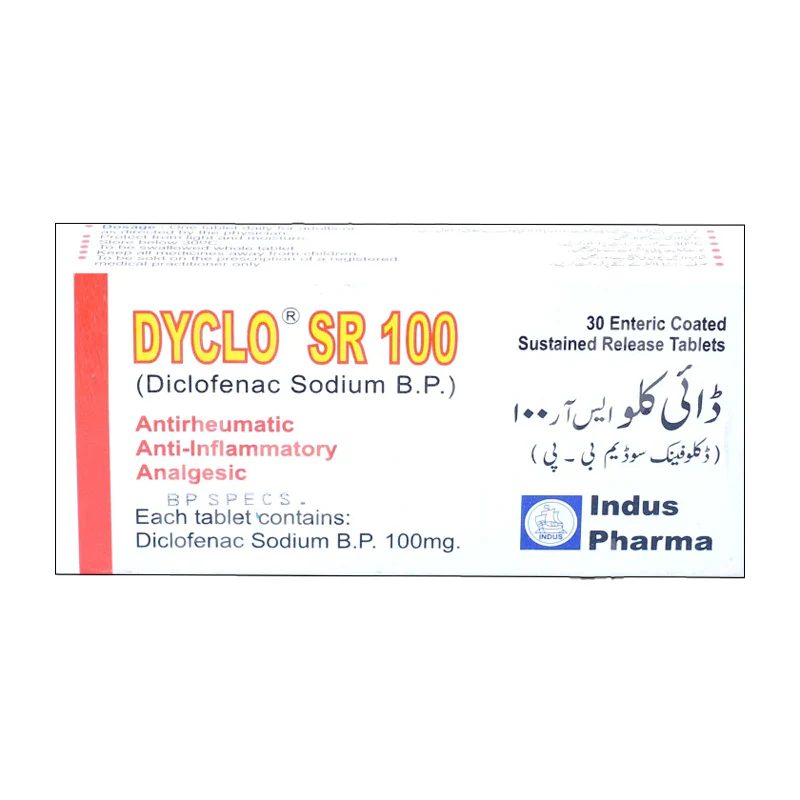 DYCLO SR 100MG Tablet is a sustained-release non-steroidal anti-inflammatory drug (NSAID) used for long-lasting relief of pain, inflammation, and swelling. It contains Diclofenac Sodium 100mg, which works by inhibiting prostaglandins that cause pain and inflammation. The sustained-release formulation allows for prolonged action with fewer daily doses. It is commonly prescribed for arthritis, back pain, musculoskeletal disorders, sprains, and post-operative pain.