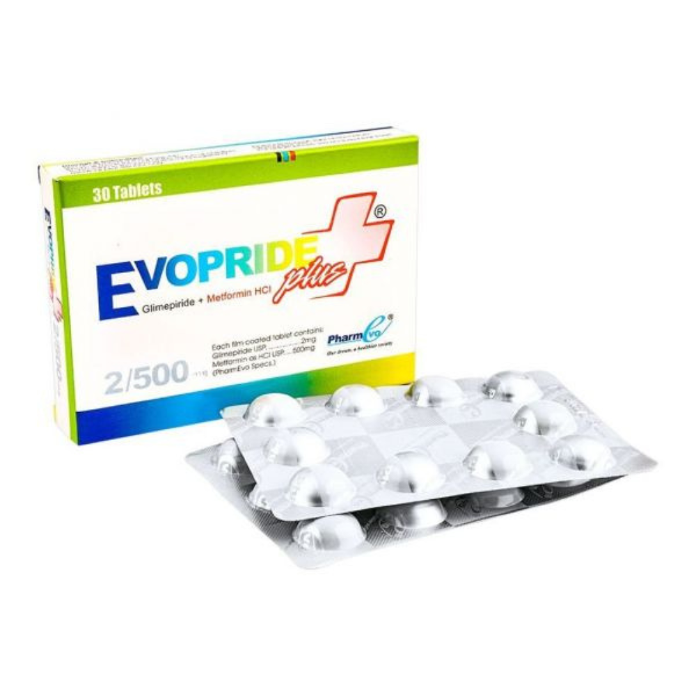 • Evopride Plus 2/500 mg combines Glimepiride 2 mg (a sulfonylurea) and Metformin 500 mg (a biguanide).