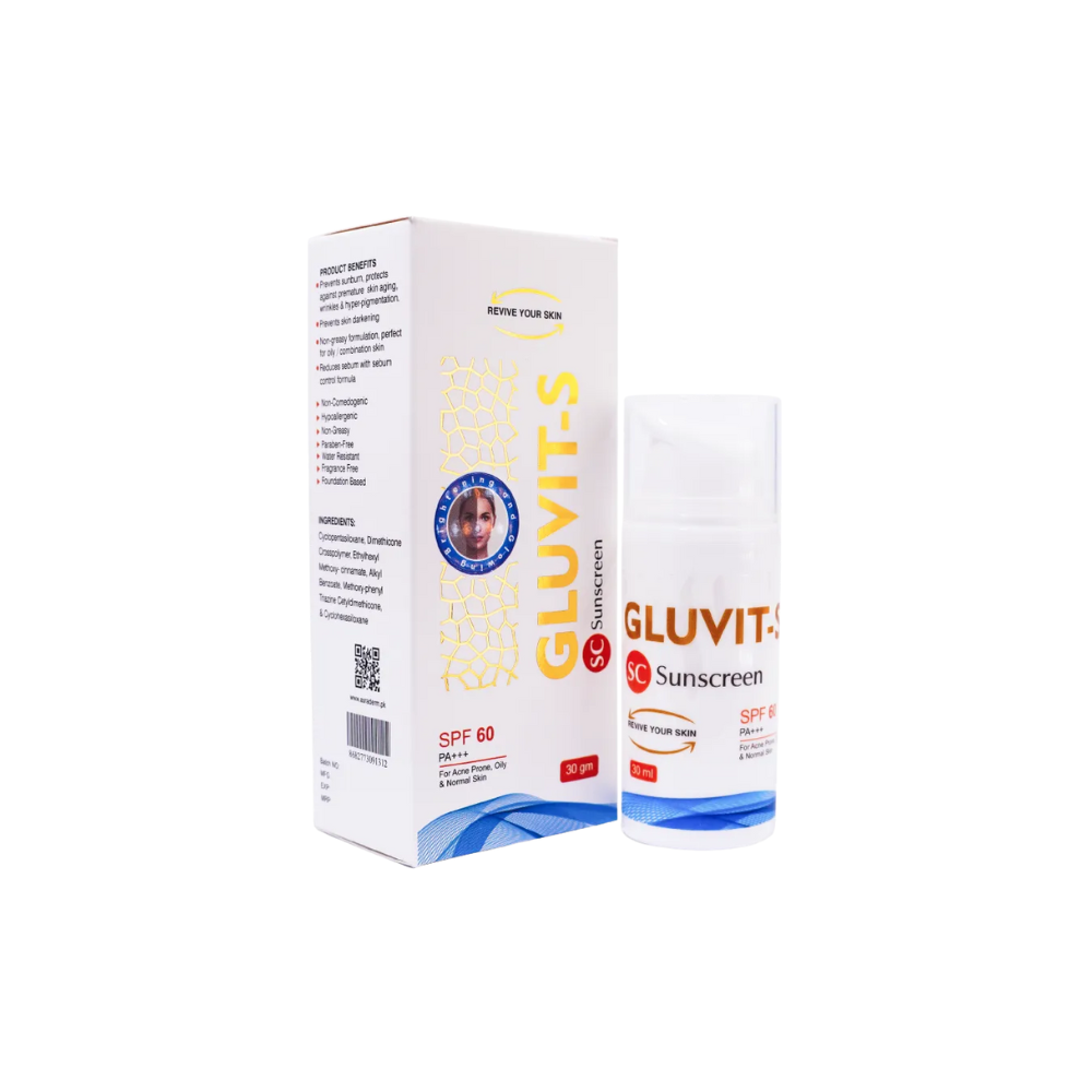 Gluvit-S Sunscreen SPF 60 is a broad-spectrum sun protection formula that shields the skin against harmful UVA and UVB rays. Enriched with skin-nourishing ingredients, it helps prevent sunburn, premature ageing, and pigmentation while keeping the skin hydrated and protected.