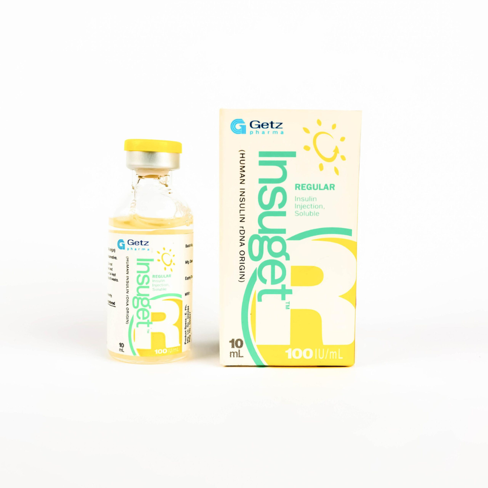 Insuget R Vial N/P is a recombinant human insulin (Regular/Short-acting) injection used to control blood glucose levels in patients with diabetes mellitus. It helps manage hyperglycemia by facilitating the uptake of glucose into cells and maintaining normal blood sugar levels.