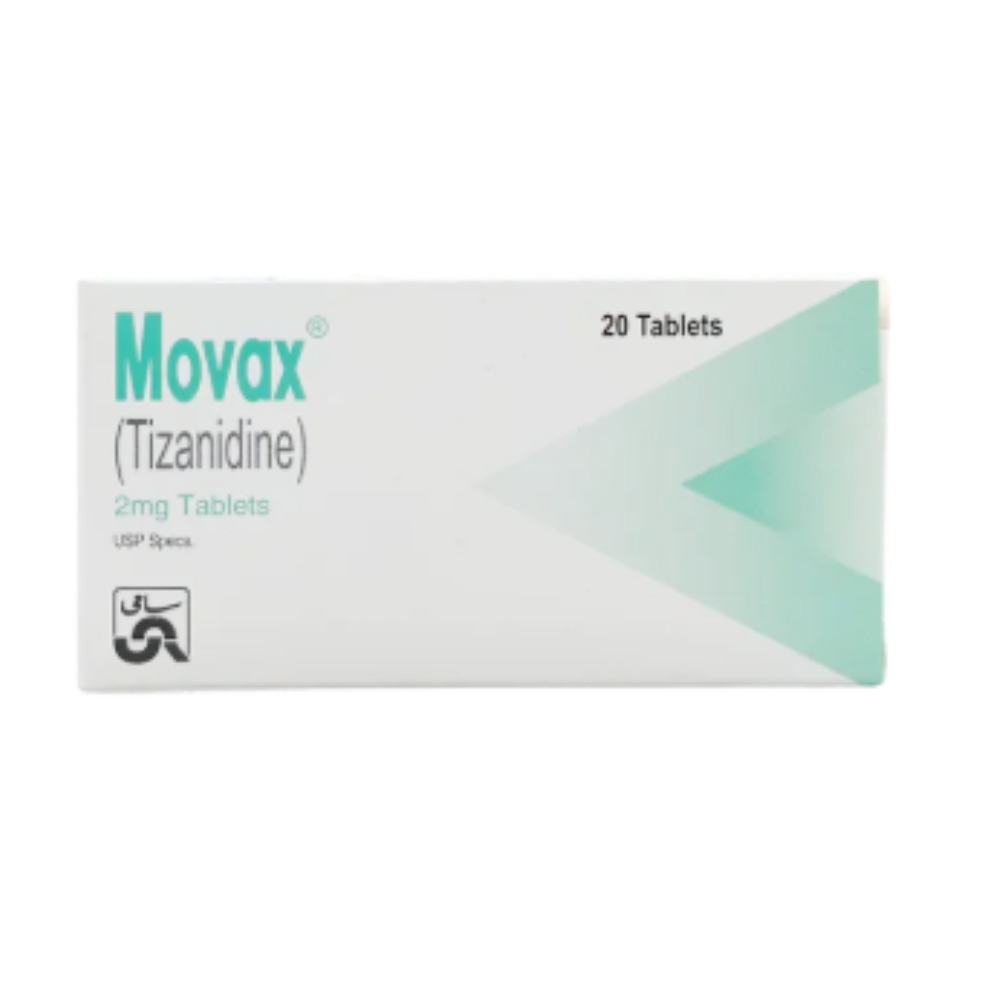 Movax 2mg tablet contains Tizanidine, used as a muscle relaxant to relieve muscle spasms and stiffness.
