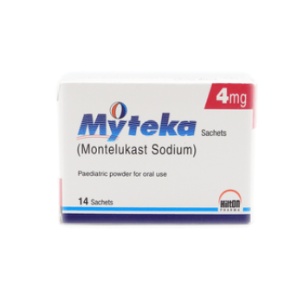 Myteka 4mg sachet contains Montelukast, used to prevent asthma attacks and relieve symptoms of allergies such as runny nose and sneezing.