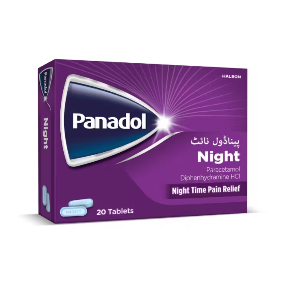 Panadol Night Tablets are designed to provide relief from nighttime pain and discomfort, aiding in restful sleep. Each tablet contains 500 mg of paracetamol for pain relief and 25 mg of diphenhydramine hydrochloride, an antihistamine that promotes drowsiness.