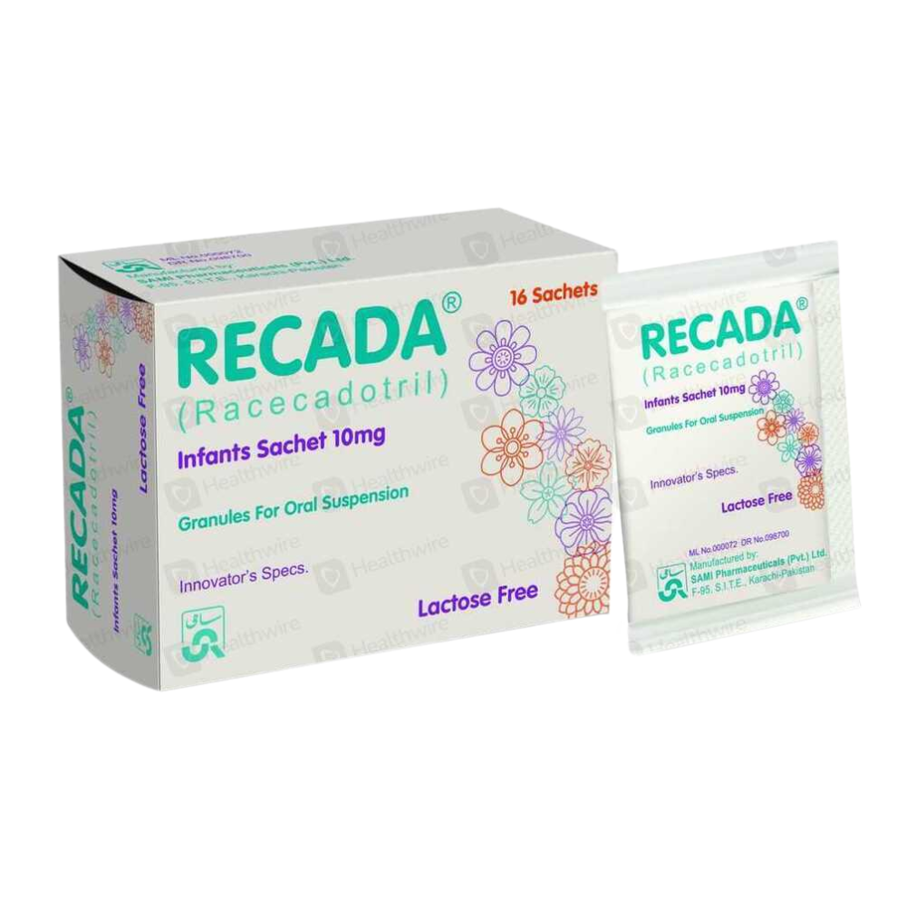 Description: RECADA INFANTS SACH 10MG contains the active ingredient racecadotril. It is used as a complementary treatment for acute diarrhea in infants and children older than three months. The medication works by reducing the excessive secretion of water and electrolytes in the intestines, which helps to decrease the frequency and volume of watery stools. It is important to use this medicine along with oral rehydration solution to prevent dehydration