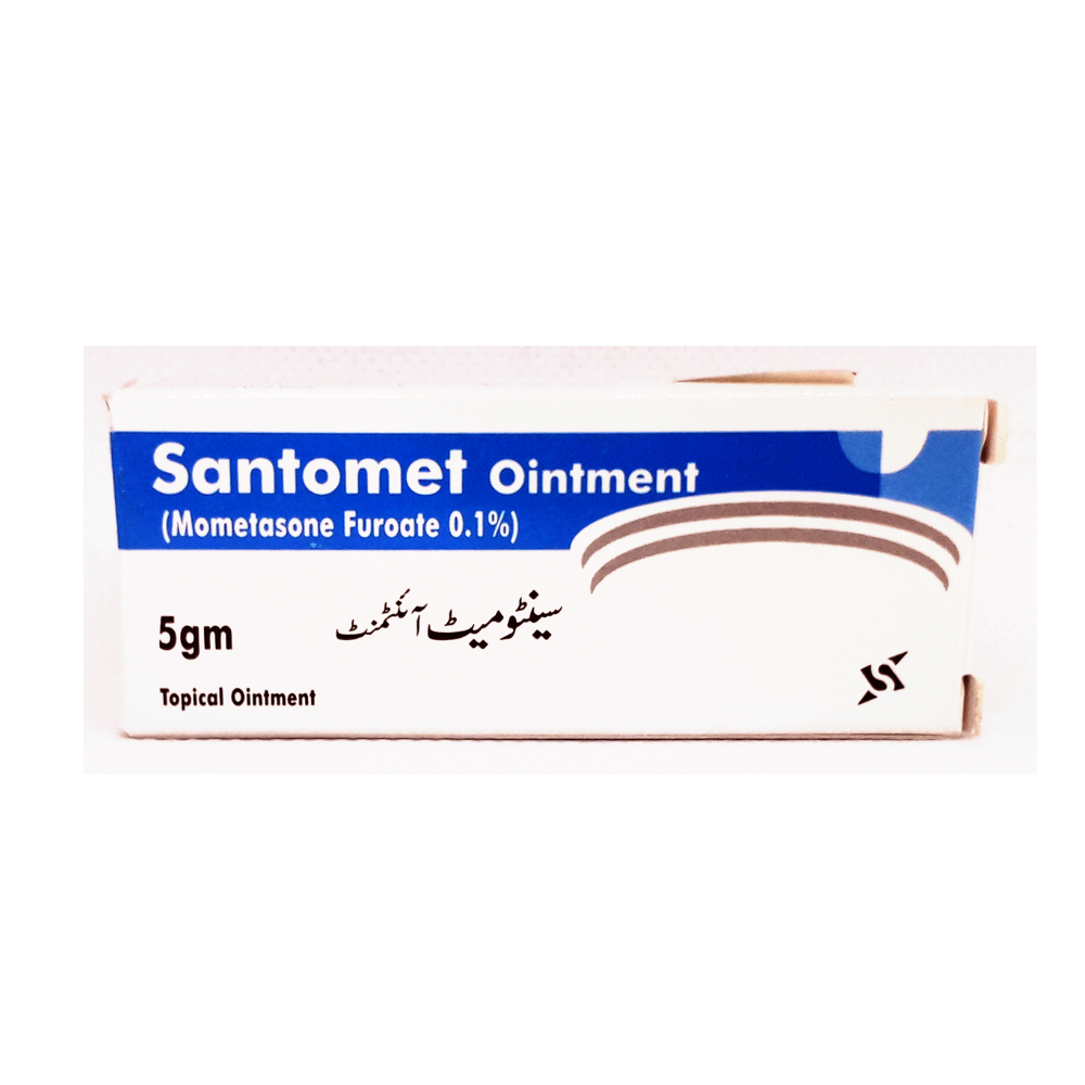 SANTOMET 0.1% 5GM OINTMENT contains the active ingredient mometasone furoate. It is a potent topical corticosteroid used to treat a variety of inflammatory and pruritic (itchy) skin conditions. The ointment form is typically used for dry, scaly skin conditions like psoriasis and chronic eczema, as it provides a protective barrier and helps to lock in moisture. It works by reducing inflammation, redness, and itching by suppressing the body’s immune response in the skin.