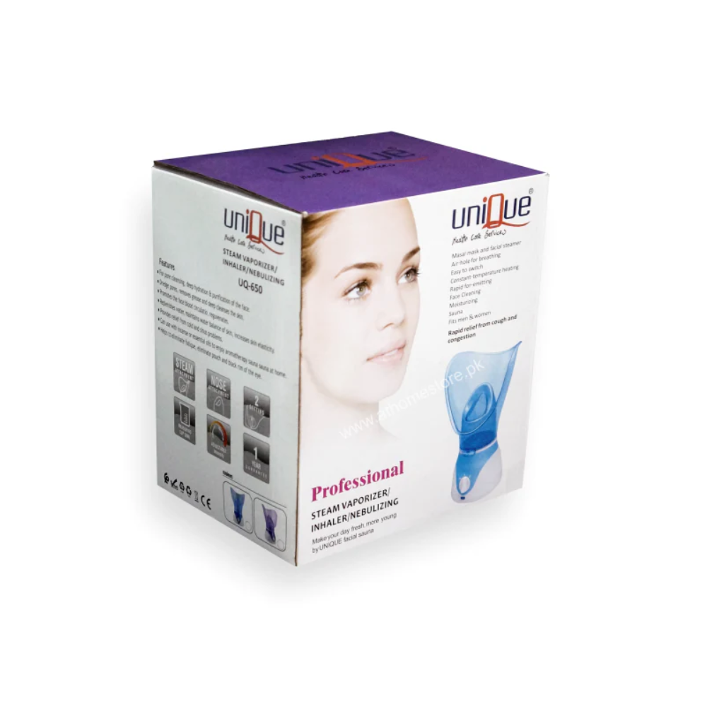The UNIQUE UQ650 is a steam inhaler or nebulizer device designed for therapeutic use. It works by converting liquid medication or saline solution into a fine, inhalable mist to provide relief from various respiratory issues. It is commonly used for managing conditions like colds, sinus congestion, asthma, and bronchitis by helping to loosen mucus and soothe inflamed airways.