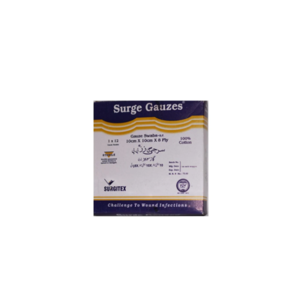 Surge Gauze 10cm x 10cm is a sterile medical dressing made from woven cotton fabric, used to cover and protect wounds, absorb exudates (fluids), and promote healing. It is commonly used in first aid, surgical procedures, and general wound care to prevent infection and keep the wound clean and dry.