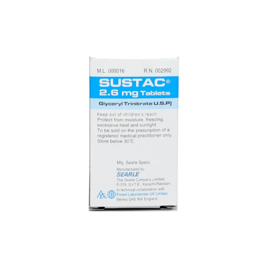 Sustac 2.6 mg Tablet contains Glyceryl Trinitrate (Nitroglycerin), which is a vasodilator used to prevent and relieve chest pain (angina) caused by reduced blood flow to the heart. It works by relaxing and widening blood vessels, allowing more oxygen-rich blood to reach the heart, thus reducing its workload and preventing angina attacks.