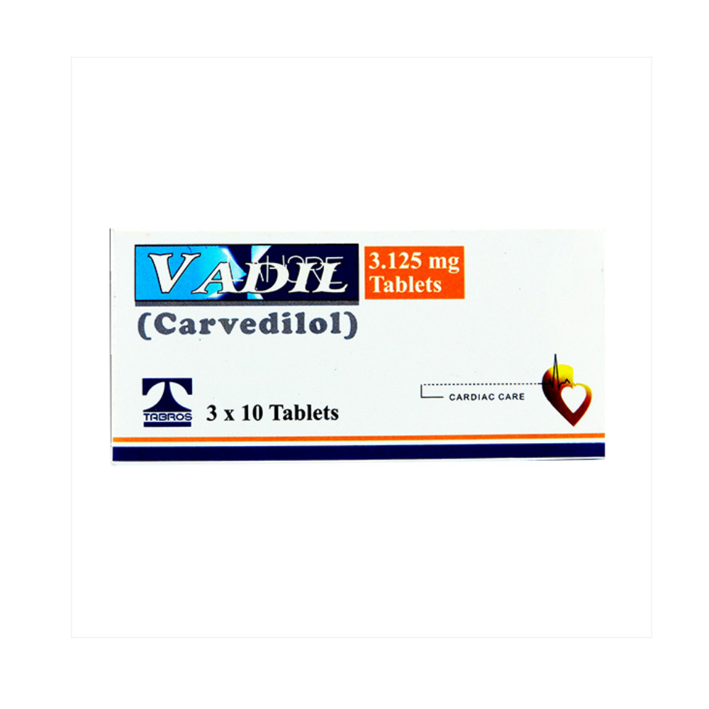 VADIL 3.125MG TAB is a medication containing the active ingredient carvedilol. It is a beta-blocker and alpha-blocker used to treat various cardiovascular conditions. This lower dose is often used for the initial treatment of heart failure. Carvedilol works by blocking the effects of certain natural substances in the body, like adrenaline, on the heart and blood vessels. This action slows down the heart rate, lowers blood pressure, and reduces the workload on the heart. It is primarily used to treat mild to severe heart failure, high blood pressure (hypertension), and angina (chest pain).