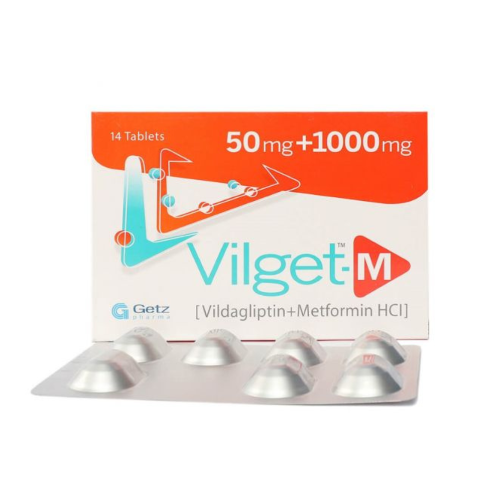 Vilget M 50/1000mg combines Metformin and another antidiabetic component to help manage type 2 diabetes. It works by improving insulin sensitivity and controlling blood sugar levels after meals.