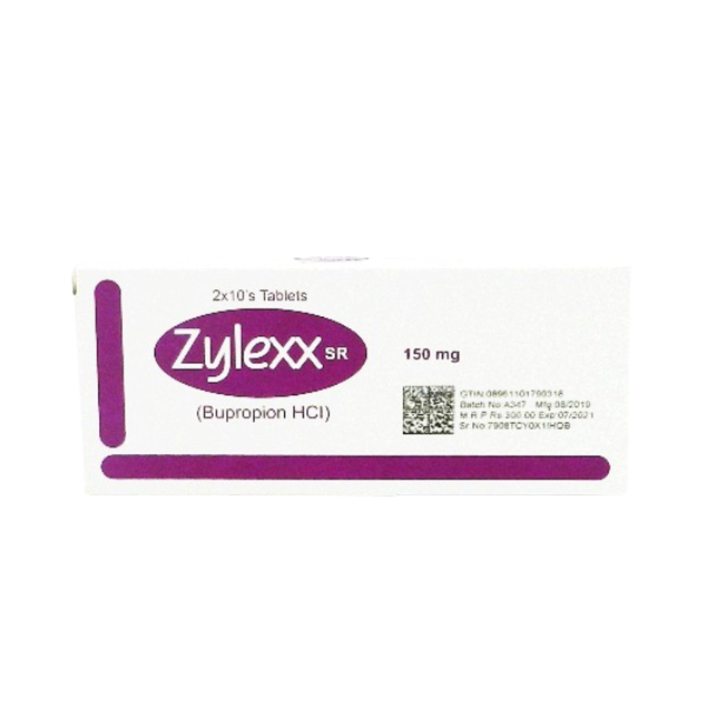 Zylexx SR 150mg contains Bupropion Hydrochloride (sustained release), an antidepressant and smoking cessation aid. It is commonly prescribed for the treatment of major depressive disorder (MDD), seasonal affective disorder (SAD), and to support individuals in quitting smoking. It works by balancing neurotransmitters (dopamine and norepinephrine) in the brain.